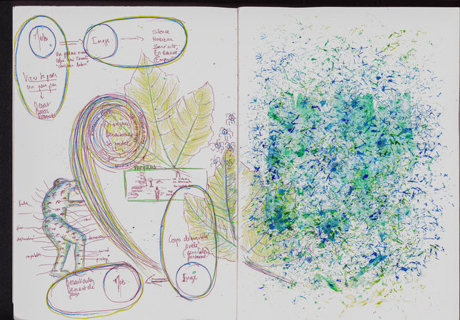 "Mon travail se déploie sur de multiples supports... Sur mes murs, toiles et papiers dialoguent, mais c'est dans mes carnets que tout commence. Chaque exploration commence par une longue phase de recherche où se mêlent croquis, notes, pensées...