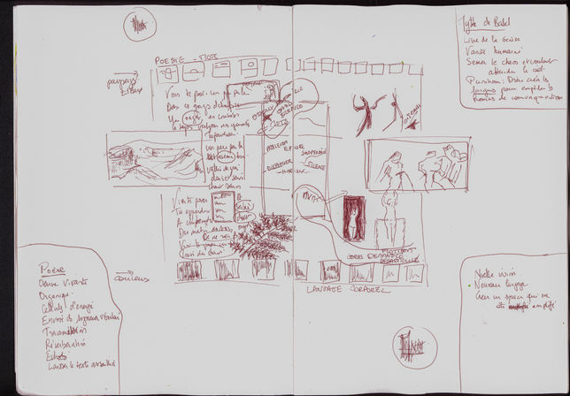 Mon carnet journalier est plus spontané, je le remplis au fil de l'eau, j'y collecte toutes les phrases qui me touchent, les définitions que je découvre, je teste des couleurs, des expressions corporelles, j'y consigne des tableaux qui me touchent, plus tard je prélève des éléments qui nourriront mon travail."