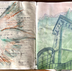« Travail émouvant sur le poème de son fils. Les mots et les formes esthétiques s'entremêlent pour créer une nouvelle fiction. Sophie s’est inspiré du lieu et de la bâtisse pour créer un nouveau paysage. On découvre à la fois son processus de création sous forme de carnet et dans sa peinture »
